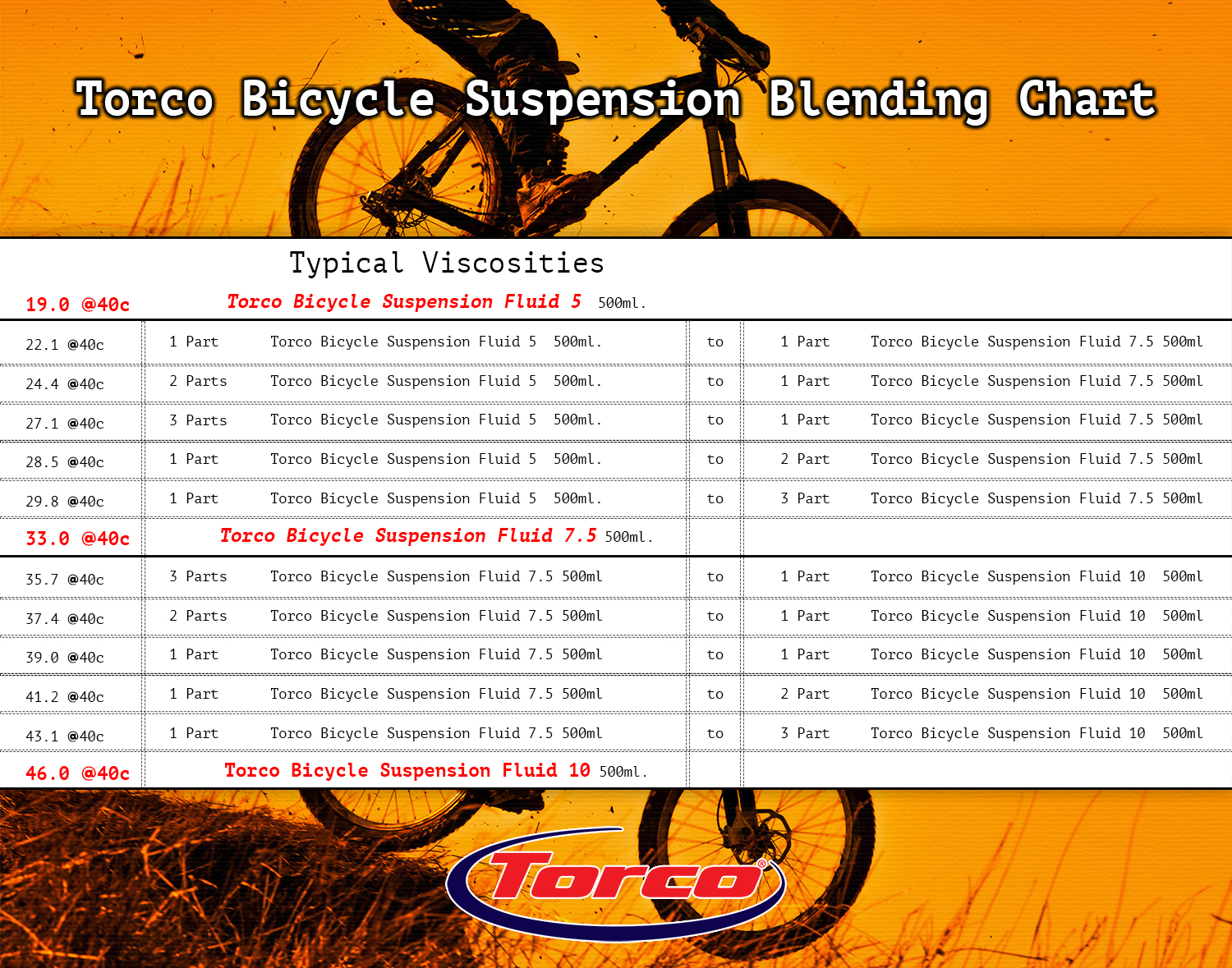 Torco continues to stay ahead of our competitors with our line of high quality suspension fluids for recreational XC Mountain Bikes to full-on Downhill Race Bikes. We understand that no two bicycle riders are the same and no two mountain bikes are the same, so we are offering the bicycle community something different… Torco now offers a line of bicycle suspension fluids that are tunable to your specific needs. Simply click on “Mixing Chart” on the torcobicycle.com website. This chart will guide you to the appropriate viscosity (cSt @ 40°C) that your application requires.